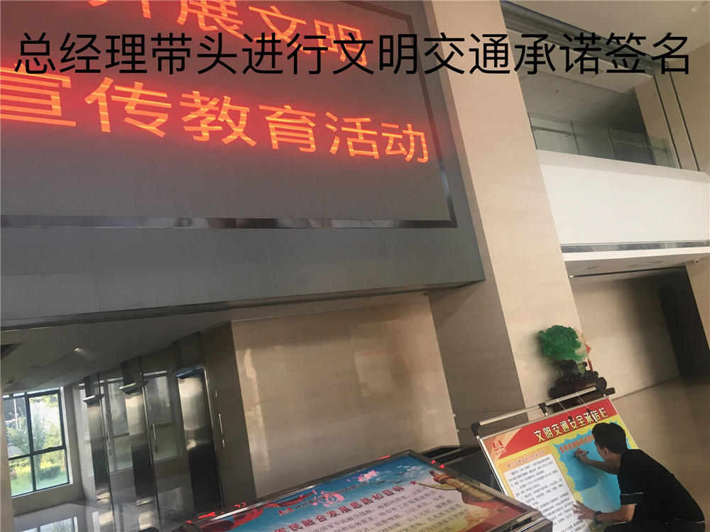 簽訂“遵守交通安全法規(guī)承諾書”。公司制作了“遵守交通安全法規(guī)承諾欄”版面十余塊,擺放在醒目位置,以部門為單位,每位員工在版面上進(jìn)行簽名承諾。公司總經(jīng)理郭釧帶頭在《文明交通承諾欄》上簽名,其他領(lǐng)導(dǎo)和部門員工也陸續(xù)進(jìn)行了簽名,通過交通安全承諾簽名,使每位員工時刻提醒自己,履行自己承諾。